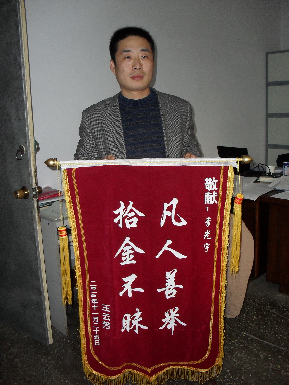次日,為了再次對(duì)李光宇同志拾金不昧的事跡表示感謝,失主還千方百計(jì)的找到我公司的具體地址,并送上一面錦旗,我們對(duì)李光宇同志拾金 不昧的精神表示深深的敬意!